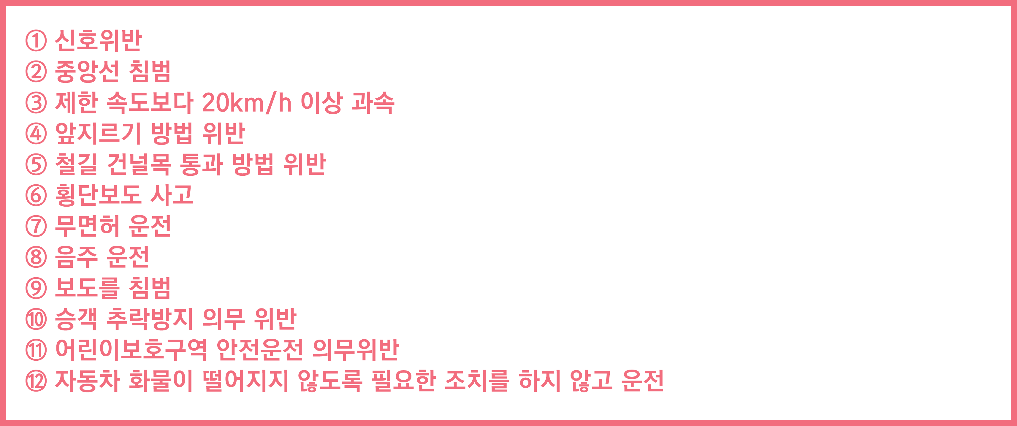 교통사고 처리 특례법에서 명시하는 12개에 해당하는 중과실 교통사고를 의미하며 내용은 아래와 같습니다.