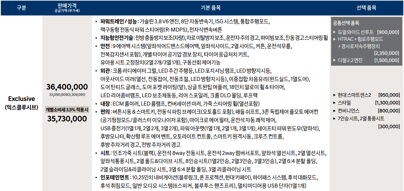 현대자동차 팰리세이드 익스클루시브 등급 옵션 비교 정리